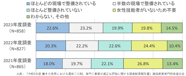 女性専用設備の整備状況のうち、女性専用トイレの設置状況については、「ほとんどの現場で整備されている」(22.6%)、「半数の現場で整備されている」(23.2%)、「ほとんど整備されていない」(19.6%)などと回答。前年度最多だった「女性技能者がいないため不要」は19.8%にまで減り、女性トイレが設置された現場が着実に増えている。