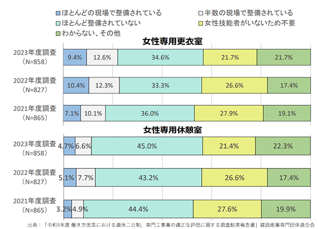 建設産業専門団体連合会(建専連)はこのほど、2023年度の委託事業として実施した「働き方改革における週休二日制、専門工事業の適正な評価に関する調査結果報告書」(PDF)を公表した。女性技能者の増加に伴って、女性用トイレを設置する現場は増えているが、女性専用の更衣室や休憩室を設置する現場は限られており、この3年間で増えていないことも分かった。女性技能者からも「住宅系は車移動で着替えなくてもいいため、更衣室がなくても問題はない」など、諦めとも慣れとも取れる意見が聞かれた。
