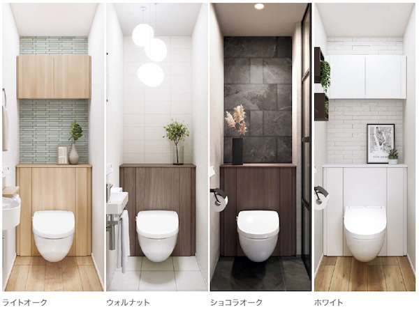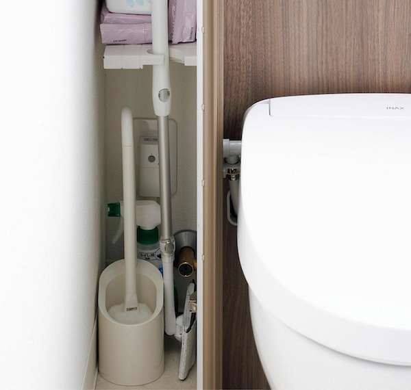 床から便器を浮かせた壁掛けスタイルのため床掃除がしやすく、給水管やコード、トイレットペーパーなどのストック、掃除道具を大容量キャビネットに隠せるのが特徴。