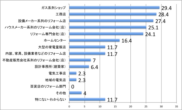 リフォーム時の相談先・依頼先については、「ガス系列ショップ」29.4%、「工務店」28.4%、「設備メーカー系列のリフォーム店」27.4%、「ハウスメーカー系列のリフォーム会社」25.1%、「リフォーム専門会社」24.1%など定番がほぼ同率で上位を占めた。一方で、「ホームセンター」16.4%、「大型の家電量販店」11.7%といった回答からは、リフォーム市場に新しいプレイヤーが台頭し定着してきたことをうかがわせた。