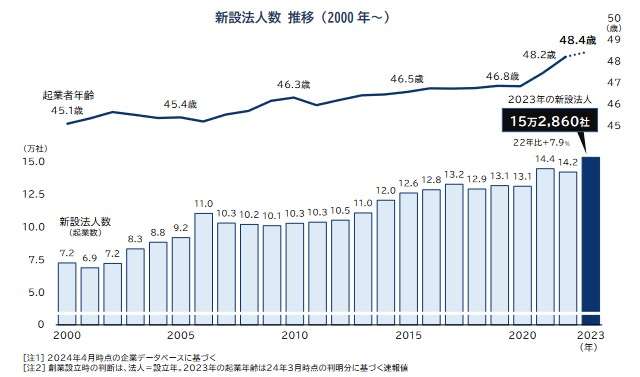 2023年の休廃業・解散件数は5万9105社(前年比10.6%増)、企業倒産件数は8497社(同33.3%増)と、いずれも新設法人の増加率を大幅に上回ったが、新設法人数としては「倒産・休廃業・解散」の総数よりも2.26倍高い水準だった。