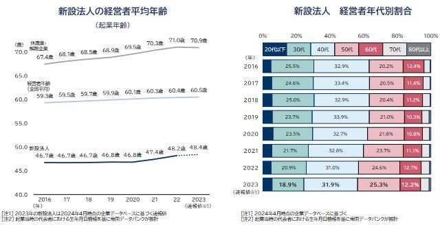 同調査は、同社が保有する企業データベースのほか、登記情報などを基に2023年に全国で新設された企業を対象に実施。設立時点の代表者情報や本社情報については、遡って最も古い情報を基に算出・推計した。