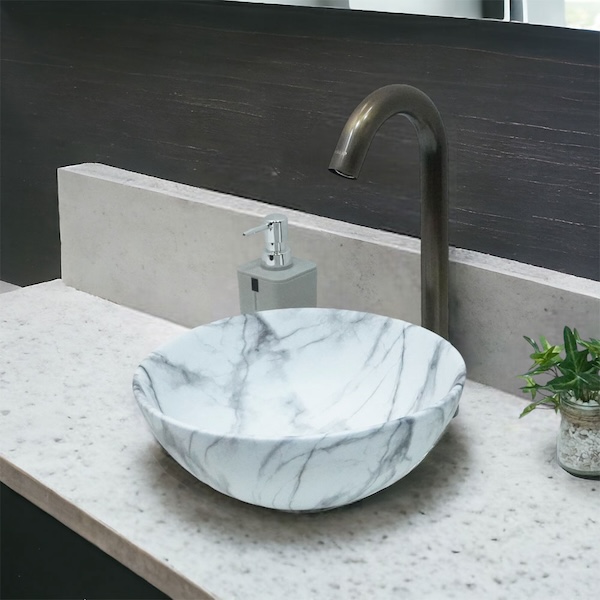 大理石調デザインの陶製洗面ボウルと自動水栓、排水栓、排水トラップをパッケージ化。水栓、排水栓、排水トラップは銀・金・黒・古金・古銅の5色から選べる。