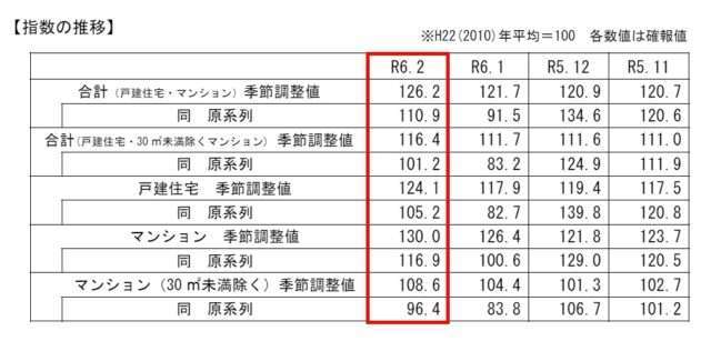 総務省統計局の「住宅・土地統計調査」で把握可能な「既存住宅取引量」には含まれていない別荘、セカンドハウス、投資用物件等を含む。各月の販売量における季節性を排除するため、月次指数において季節調整を行う。