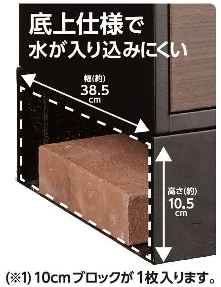 宅配ボックスの底部分に高さ10.5㎝、奥行38.5㎝の重石を入れるスペースが設けられてあり、そこにレンガなどの重石を入れるだけでズレや転倒を防いで手軽に設置できるのが特徴。底部分が上げ底になっているため、床からの水が本体に入り込みにくい。