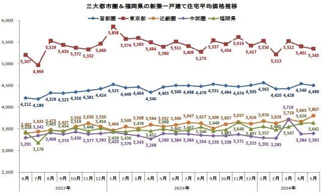 首都圏(1都3県)の平均価格は、前月比0.9%減の4499万円と反転下落した。東京都が1.0%減の5345万円と2カ月連続下落し、前年同月比もマイナスが続く。神奈川県は1.0%増の4904万円と3カ月連続上昇。千葉県は2.2%増の3775万円、埼玉県は0.3%増の3802万円と、いずれも2カ月連続で上昇した。前月に続き価格水準の高い東京都が下落したほか、埼玉県の上昇率が縮小し、首都圏全体では下落に転じた。