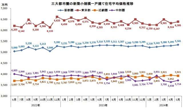 首都圏の新築小規模一戸建ての平均価格は、前月比0.9%増の5341万円と4カ月連続で上昇した。東京都は1.1%増の6395万円と反転上昇した。神奈川県は4974万円(2.9%増)と2カ月連続で上昇。横浜市が牽引する形で、2014年4月の集計開始以降最高額を更新した。一方、千葉県は4334万円(1.7%減)、埼玉県は4319万円(0.8%減)といずれも反転下落したが、首都圏全体では上昇率が拡大した。