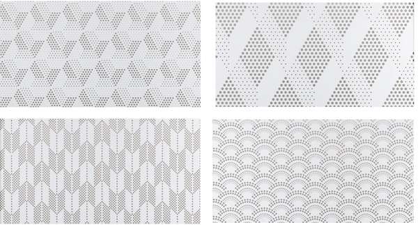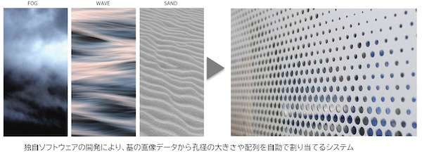 子会社の日海不二サッシ(石川県金沢市)が画像を取り込み、アルミパネルに開けるパンチング孔の大きさ・配列を自動で割り当てるソフトウェアを独自開発しており、これを使って霧、波、砂などの自然をテーマにしたデザインや立体柄、和柄などのデザインを一貫生産する。