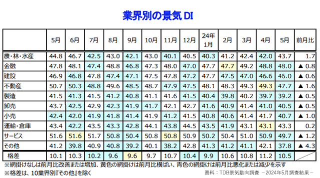 帝国データバンク(TDB、東京都港区)が6月5日公表した、2024年5月の景気動向調査結果によると、景気DIは前月比 0.6ポイント減の43.5となり、2カ月連続で悪化した。国内景気は個人消費が低迷したことや、原材料価格の高止まりによるコスト負担増などにより後退。「2024 年問題」への対応に伴うコスト負担増、不十分な価格転嫁なども景気を下押する要因となった。今後の景気は横ばい傾向で推移すると予想されており、実質賃金のプラス転換が鍵となるもよう。