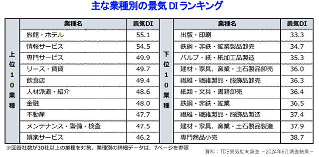 主な業種別の景気DIランキング(報道資料より引用)