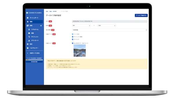 1つの現場に複数台のカメラ設定が可能で、任意の期間・時間・抽出頻度を指定して画像をアーカイブ化できる。