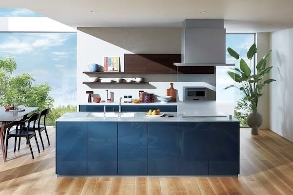写真セット363万8030円(税込、周辺ユニット部除く、組立費別途、フラット対面型2740mm、扉色:ペルラブルー、カウンター色:ラールブル)