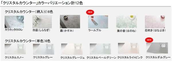 「クリスタルカウンター」は、すりガラスのような美しい質感と、熱・衝撃への強さが特徴の独自アイテム。今回は、夜明け前の空模様をグラデーションで表現した「ラールブル」(柄入り)と、落ち着きのあるグレー「クリスタルダルグレー」(単色)をラインアップした。