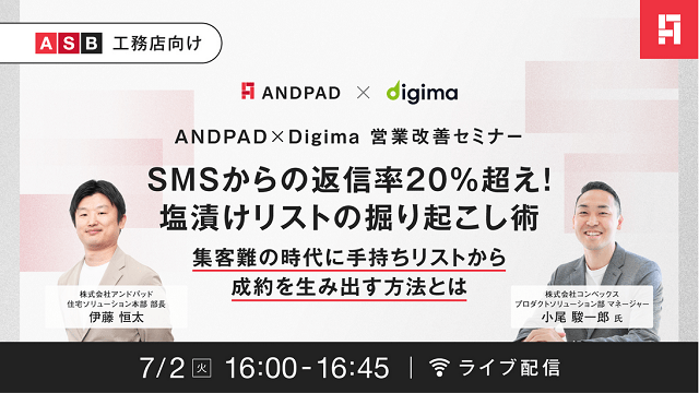 アンドパッド(東京都千代田区)とコンベックス(東京都渋谷区)は、工務店向けの営業改善セミナー「SMSからの返信率20%超え!塩漬けリストの掘り起こし術 ~集客難の時代に手持ちリストから成約を生み出す方法とは~」を7月2日、オンラインにて共催する。申込期間は6月30日まで。参加費無料。