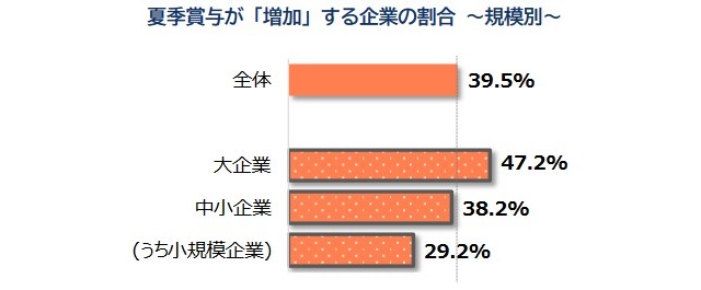 「賞与あり、増加する」企業を規模別でみると、「大企業」が前年比4.9ポイント増の47.2%で、全体(39.5%)を7.7ポイント上回った。一方、「中小企業」は38.2%(同1.7ポイント増)、「小規模企業」は29.2%(同1.9ポイント増)となり、「大企業」と比較して小幅な上昇にとどまった。特に「小規模企業」では、増加する割合が全体を約10ポイント下回った。