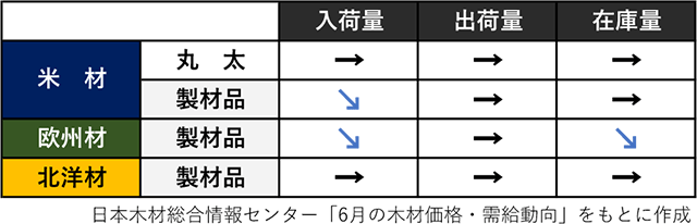 (一財)日本木材総合情報センター(JAWIC)が6月14日公表した「6月の木材価格・需給動向」によると、米国製材(米材)は製材品のみ入荷量が減少。その他の入出荷量・在庫量は、ほぼ横ばいで推移した。欧州の製材品は入荷・在庫量が減少。北洋材はほぼ横ばいとなっている。