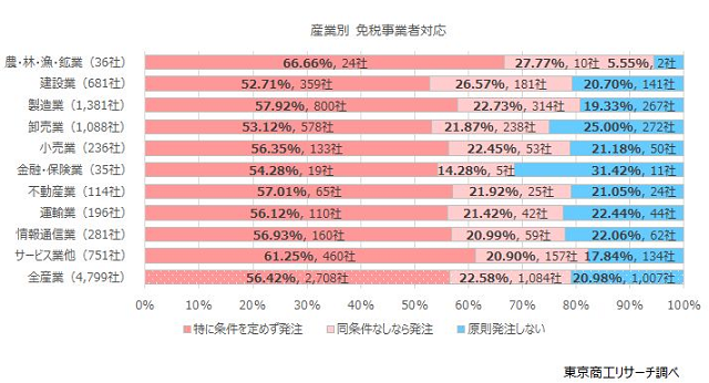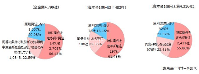 産業別では、「特に条件を定めず発注」は不動産業が57.0%(114社中65社)と全体(56.4%)より高く、建設業は52.7%(681社中359社)と10産業のなかで最低となった。一方、「原則発注しない」は建設業が20.7%、不動産業が21.0%で、最も高率なのは金融・保険業の31.4%だった。