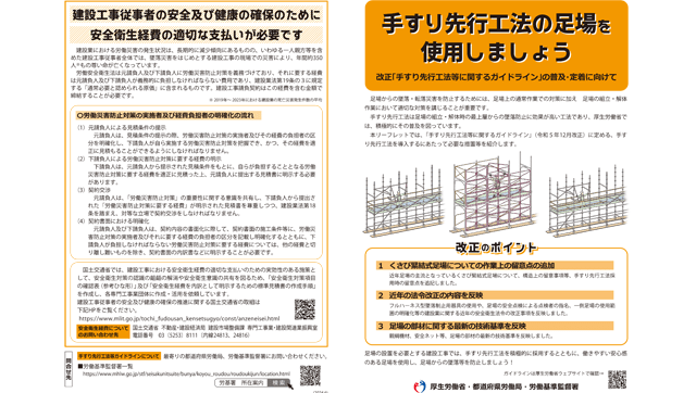 厚生労働省はこのほど、昨年12月に改正された「手すり先行工法等に関するガイドライン」の普及・定着を目的としたリーフレット「手すり先行工法の足場を使用しましょう」(PDF)を作成した。