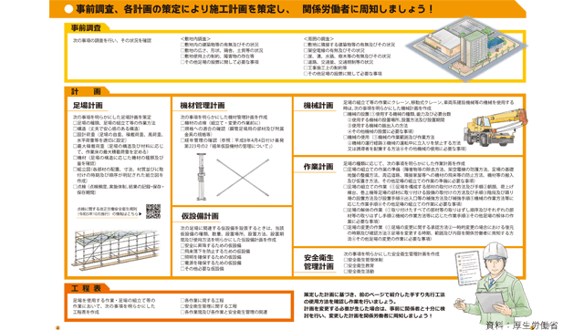 その内容をもとにリーフレットでは、手すり工法の種類、種類別の性能、使用方法などの項目を図入りで解説。チェックリストでは、▽事前調査(敷地内・周囲)▽計画(足場・機材管理・仮設備・機械・作業・安全衛生管理)▽工程表―の必要事項を一覧にした。組立て作業に当たっての留意事項なども記載している。