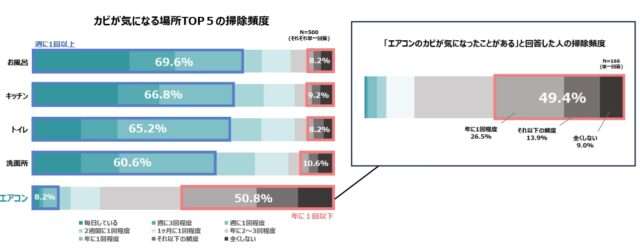 「カビが気になる場所」としてお風呂・エアコン・洗面所・キッチン・トイレについて掃除の頻度を質問したところ、エアコン以外は約6割以上が「週に1回程度」と答えたのに対し、エアコンは約5割(50.8%)が「年に1回以下」しか掃除をしないことが分かった。また、「エアコンのカビが気になったことがある」と回答した人でも、約5割(49.4%)が掃除頻度は「年に1回以下」と回答している。
