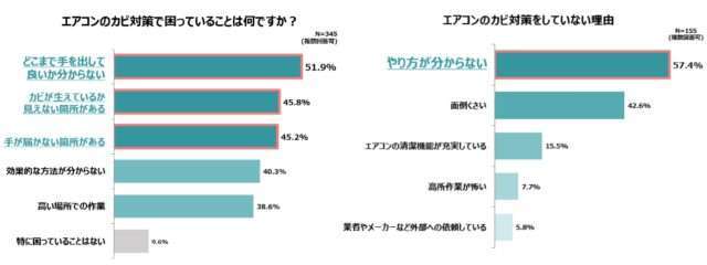 さらに、「エアコンのカビ対策で困っていること」について尋ねたところ、「どこまで手を出して良いか分からない」と回答した人が最も多く、約5割(51.9%)にのぼった。他に「カビが生えているか見えない箇所がある」(45.8%)、「手が届かない箇所がある」(45.2%)が続いた。カビ対策をしていない理由では「やり方が分からない」が最も多く、約6割(57.4%)となっていることから、エアコンの複雑な構造による手入れの煩わしさから、エアコンの掃除の頻度が少ないことが推測される。