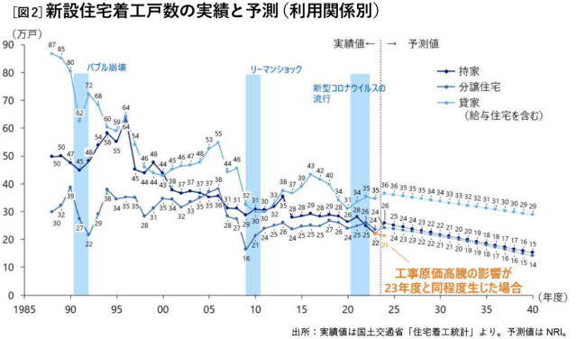 また直近では、工事原価の上昇が継続しないとすれば24年度の新設着工戸数は全体で86万戸、うち持ち家は26万戸を見込む。一方で原価上昇が続いた場合は全体で82万戸、持ち家は21万戸にとどまるとした。