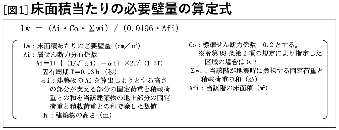 国土交通省は、2025年4月1日の改正建築物省エネ法に向け、木造建築物の軸組の構造方法および倍率、壁量に関する基準、柱頭・柱脚の仕口の構造方法に関する告示の一部改正について、告示第447号としてその内容を定めた。壁量に関する基準(平成12年建設省告示第1352号)については、地震に対する必要壁量の算定基準を改正し、床面積当たりの必要壁量を、層せん断力分布係数、標準せん断力係数、固定荷重・積載荷重などによって求めるとした[図1]。施行は25年4月1日を予定。