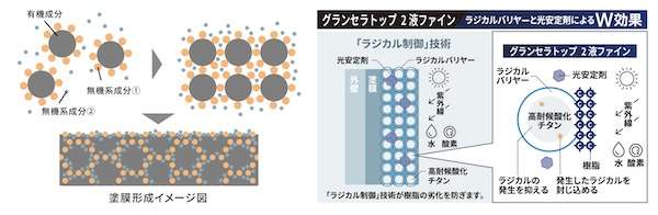 新商品は、フッ素樹脂塗料を超える高耐候性が持ち味。2液弱溶剤形でコンクリート面や窯業サイディングボード面、金属面など幅広い素材に対応する。