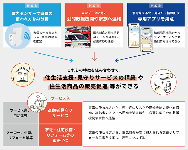 同サービスでは、エンドユーザー宅内の分電盤に電力センサーを取付け、電力波形を計測。AIが家電の使用状況を分析し、生活リズムの変化や認知機能低下の予兆等を探知する。異常を探知した場合は、必要に応じて公的救援機関や家族等へ通報、連絡する。専用アプリでは、家の状況や家電の使われ方の確認から熱中症等のアラーム通知、キャンペーン案内などの情報配信が可能。さまざまな業界や自治体が独自の「住生活支援・見守りサービス」を構築できるほか、エンドユーザーへの販売促進など事業に活用できるという。