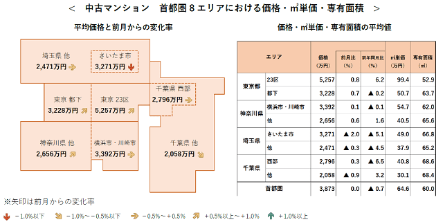 首都圏全体の1戸あたりの平均価格は、前月比横ばいの3873万円。全8エリアのうち5エリアが前月比プラスとなり、東京23区・神奈川県他は2017年1月以降最高額を更新した。前年同月比は0.7%減と7カ月連続で下落した。