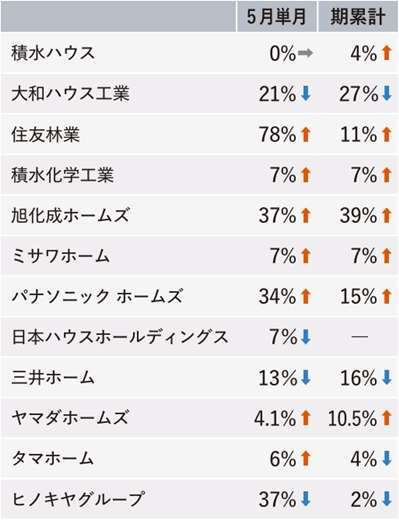 減少は4社。大和ハウス工業(21%減)は14カ月連続で減少した。日本ハウスホールディングス(7%減)、三井ホーム(13%減)も減少。ヒノキヤグループ(37%減)は、4カ月ぶりに減少へと転じた。