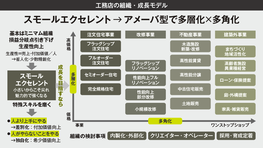 損益分岐点が低いスモール組織は多くの受注を目指す必要がないため尖ることができ、それを求める層に深く刺さる=差別化・独自化によるエクセレントなものづくり・経営ができる。さらに成長を目指すなら「多層化」=価格の層をつくること、「多角化」=事業の柱を増やすことを考える