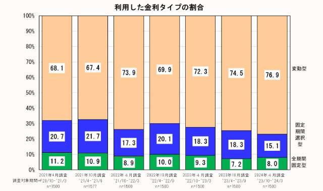 住宅金融支援機構(東京都文京区)は6月28日、住宅ローン利用者の実態調査(2024年4月調査)の結果を公表した。2023年10月~2024年3月に住宅ローンを借り入れした1500件を対象にした調査で、利用した金利タイプは「変動型」が8割に迫る一方、「全期間固定型」は微増、「固定期間選択型」は減少した。「変動型」は76.9%(2023年10月調査74.5%)、「全期間固定型」8.0%(同7.2%)、「固定期間選択型」15.1%(同18.3%)だった。