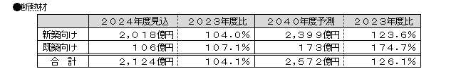 断熱材は、前年度比4.1%増の2124億円の見込み。2025年度以降の省エネ基準適合の義務化に伴い、高性能製品への需要と一戸当たりの使用量が増えていることから、市場が拡大するとみられる。断熱等性能等級が5以上に引き上げられる2030年度以降は、新築着工戸数の減少で伸びの鈍化が予想され、既築向けの獲得が課題となる。断熱等性能等級6以上の展開を視野に、メーカー同士が協業する動きもみられる。2040年度は2023年度比26.1%増の2572億円と予測する。