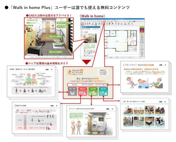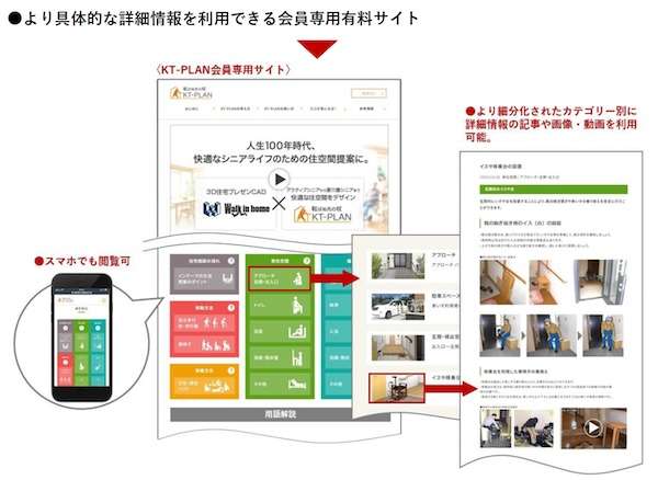 KT-PLANは、シニア層の長期的な自立生活をサポートするため、シニア層向けの新築・リフォーム設計提案のノウハウ・ヒントを提供するとともに、「Walk in home Plus」とあわせて利用することでプランニング時のバリアフリーチェックなどが可能になるサービス。