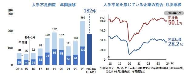 帝国データバンク(東京都港区)は7月4日、「人手不足倒産の動向調査(2024年上半期)」の結果を発表した。上半期(1-6月)の人手不足倒産は182件と前年同期(110件)から大幅に増加し、2013年以降の最多件数を2期連続更新した。なお、全体の約8割にあたる143件が「従業員10人未満」の小規模事業者だった。