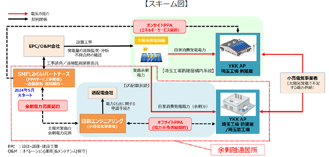 YKK AP(東京都千代田区)、日鉄エンジニアリング(東京都品川区)、三井住友ファイナンス&リース(東京都千代田区)子会社のSMFLみらいパートナーズ(東京都千代田区)の3社は、オンサイト型太陽光発電エネルギーサービスの新スキーム「発電余剰電力融通型オンサイトPPA」の運用を5月に開始した。YKK AP埼玉工場新建屋(埼玉県美里町)で発電される再エネ電力を、埼玉工場旧建屋と埼玉窓工場(埼玉県久喜市)の同社2施設にも託送供給することで、再エネ電力を100%有効活用する体制を整えた。
