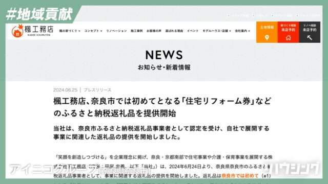 楓工務店は奈良県奈良市に対し、ふるさと納税の返礼品として「住宅リフォーム券」などの提供を始めた。納税額に応じて最大100万円分のリフォームが実施できるほか、新築時の図面作成費として使用できるチケットや、シニア向け事業の利用券も返礼品として提供している。