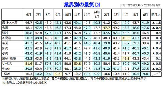 帝国データバンク(TDB、東京都港区)が7月3日公表した、2024年6月の景気動向調査結果によると、景気DIは前月比0.2ポイント減の43.3となり、3カ月連続で悪化。「建設」は0.4ポイント改善し、46.4となった。今後の見通しは、日本銀行の追加利上げや人手不足の継続などマイナス要因も多いことから、産業全体で横ばいに推移する見通し。