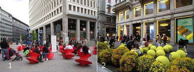 | 1.サンバビラ広場ではSPUN Rocking Chairが置かれ、楽しみ上手なミラノ市民がひっきりなしにやってくる。この先にはトップブランドのメーカーショールームが並ぶVia Duriniがある 2.ブランドのショールームが並ぶVia Durini、TechnoGymショールーム前には40周年記念のバランスボールがゴロゴロ… |