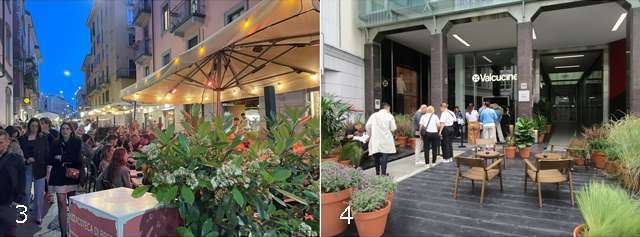 | 3.ブレラ美術館のある一帯《BreraDesignDistrict》の深夜の賑わい 4.MOSCOVA出口を上がった広場に面したValCucineのショールーム。エントランスにはグリーンとアウトドア家具が置かれている |
