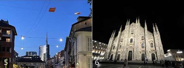 | 5.通りの向こうにはUnicreditタワーが浮かび上がる 6.ミラノといえばDuomo。夜11時近く、ようやく静かになった広場から仰ぎ見るライトアップされた大聖堂の荘厳なたたずまい |