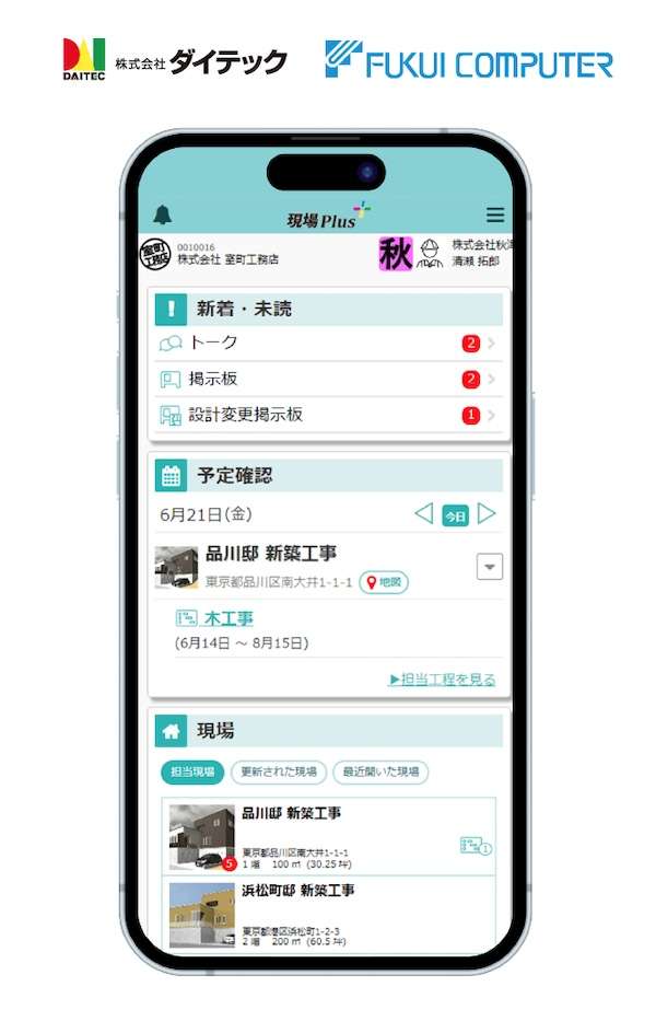 ダイテック(東京都品川区)と福井コンピュータアーキテクト(福井県坂井市)は、施工管理アプリ「現場Plus」の新機能「新着・予定ダッシュボード」を7月16日にリリースする。