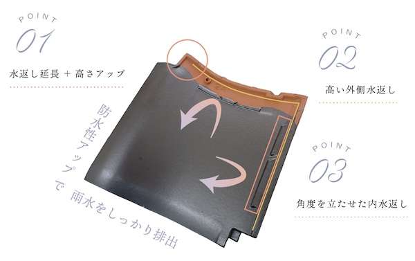 これにあわせて、専用の役瓦についても防水性能の向上を図り、これまで4.0寸勾配以上の屋根に使用を限定していたが、新商品は2.5寸勾配までの緩勾配屋根にも対応可。