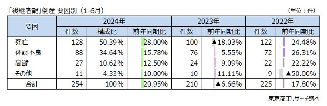 東京商工リサーチ(東京都千代田区)はこのほど、2024年上半期(1-6月)の「後継者難」倒産の調査結果を発表した。後継者不在に一因する「後継者難」倒産(負債1000万円以上)は、前年同期比20.9%増の254件と、2013年度の調査開始以降最多件数を更新。年間で初の500件超えの可能性が出てきた。