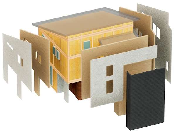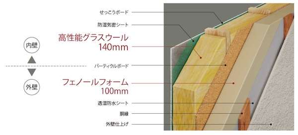 高性能グラスウール140mm厚を室内側に、フェノールフォーム100mmを室外側に配したダブル断熱と、空気層にアルゴンガスを封入したトリプルガラスサッシ、高性能玄関ドアなどでUA値0.26を達成した。
