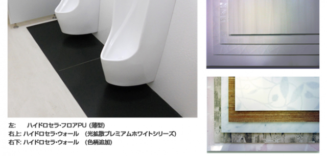 新製品は、光触媒技術「ハイドロテクト」により抗菌、防汚、防臭機能を持つ内装用大型陶板で、厚みを従来の12.5mmから5mmへと大幅に薄くすることで段差を軽減した。シート、タイル、石材等の既存床の上に貼ることも可能。
