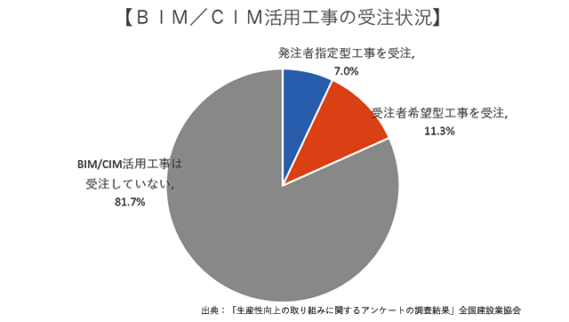 全国建設業協会(全建)が7月16日に公表した「生産性向上の取り組みに関するアンケートの調査」結果によると、BIM/CIM活用工事の受注実績があると答えた会員企業は、「発注者指定型工事を受注」では7.0%、「受注者希望型工事を受注」では11.3%にとどまり、BIM/CIM活用工事の受注が進んでいない状況が明らかとなった。さらに、発注者・設計者・施工者間での3次元データの連携がうまくいかず、生産性向上を実感できない様子が垣間見られる結果となっている。