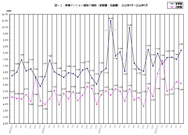 新築マンション価格の推移(首都圏・近畿圏)2021年6月~2024年6月