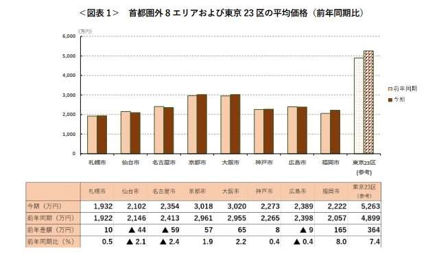 平均価格は、札幌市が1932万円(前期比0.2%増)、京都市が3018万円(同3.4%増)、大阪市が3020万円(同1.7%増)で、2017年Ⅰ期以降最高額を更新した。